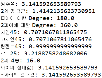 System.out.println("파이에 대한 Degree: "+Math.toDegrees(Math.PI));